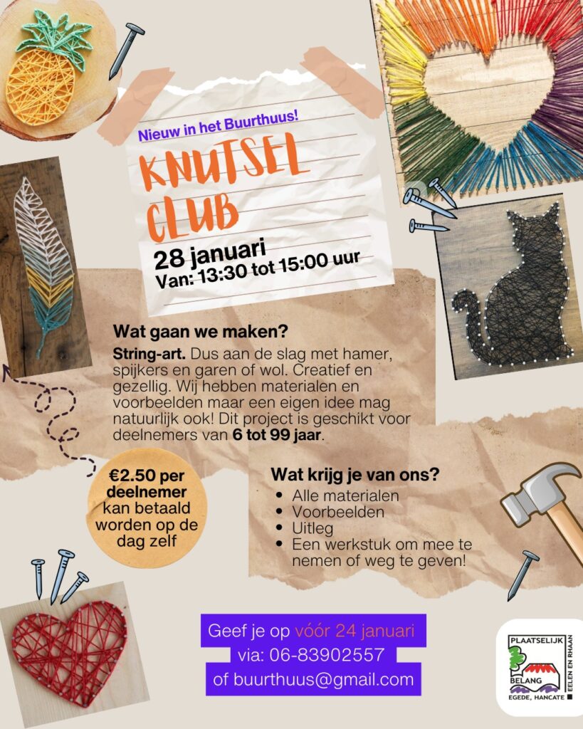 Geplaatst inBuurt-Activiteiten 28 Januari | Knutselclub Geplaatst door Plaatselijkbelang 29 december 2025 Knutselmiddag voor de jeugd. Bericht navigatie Vorige bericht 24 Januari | Bingo avond 2026!Volgend bericht4 Maart | Knutselclub